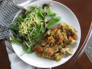 Cook the spaghetti squash for 45 minutes to 1 hour at 400.  Either cut it in half before and seed or cook it whole.  It will take a little longer if you cook it whole.  We added a sandwich bag of homemade basil pesto (about 3/4 cup).  We cut up a tomato, onion and 1/2 cup of mushrooms and sauteed in olive oil for about 3-5 minutes.  We seasoned the chicken breast with Trader Joe’s 21 Seasoning Salute and baked for about 35 minutes at 375.  We served it warm with harvati cheese grated on top.
