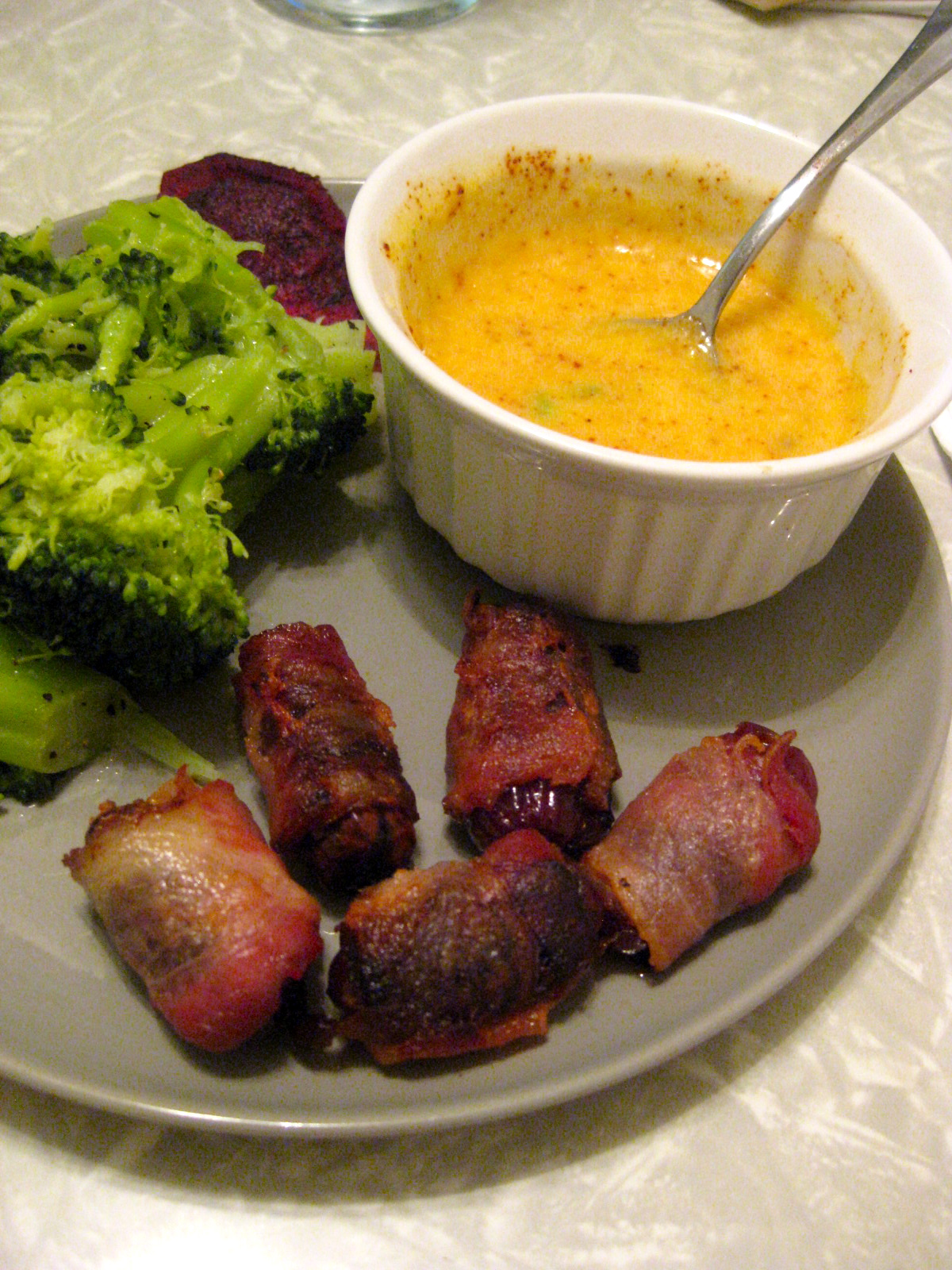2. Cut 5 strips of bacon in half. Wrap ten medjool dates in the bacon and cook for 30 minutes at 350 degrees.