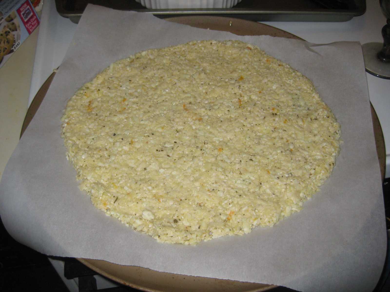 - Take cauliflower out and combine all ingredients in the bowl until well mixed. Grab a pizza pan and spread out your parchment paper.