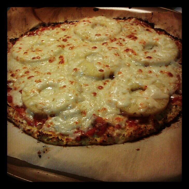 Not any more! I’ve also been reading about cauliflower crusts for the past year but been too skeptical to try it out. Shame on my doubting heart, it is AWESOME! This recipe is by no means terribly original as I’m sure it’s an amalgamation of other recipes but it is incredibly tasty, crunchy, and crusty. Welcome to my version of Hawaiian pizza!